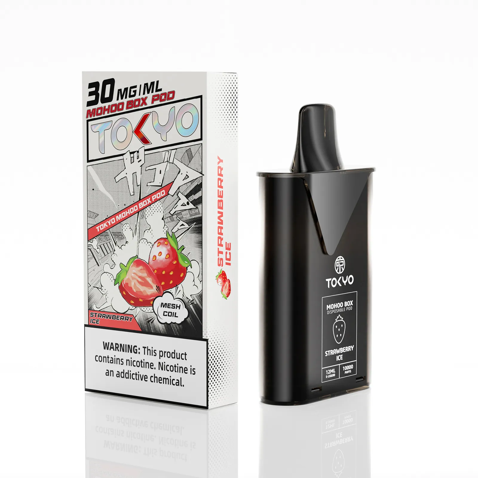 東京魔盒電子煙煙彈採用植物甘油與丙二醇基底,搭配高純度尼古丁鹽,容量 12 mL、尼古丁強度 30 mg/mL(3%),搭載 1.0Ω 鋼網棉霧化芯,設計為一次性 pod,約 10,000 口,吸引力持久。